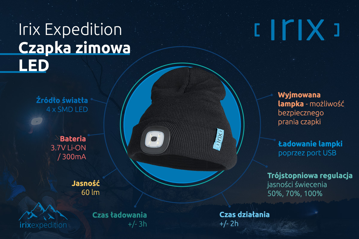 Wbudowana lampka LED. Po co nosić dodatkowe latarki, obciążać niepotrzebnie swój bagaż i zmniejszać komfort pracy przy ich użytkowaniu? Zimą, gdy dni są krótkie i praca po zmierzchu staje się codziennością, czapka Irix z wbudowaną lampką pozwoli Ci na proste i wygodne oświetlenie swojego otoczenia i sprzętu, a także wyeliminowanie niepotrzebnych obciążeń, np. przy górskich wyprawach fotograficznych. Lampka daje światło o dużej mocy 60lm. Czapka Irix Expedition wykonana została z oddychającego materiału, dzięki czemu poza codziennym użytkowaniem, sprawdzi się także przy aktywnościach fizycznych. Jest lekka i miękka, co uprzyjemnią jej noszenie. Uniwersalny krój i czarny kolor sprawią, że będzie pasować do każdej stylizacji zarówno w mieście, jak i w górach.